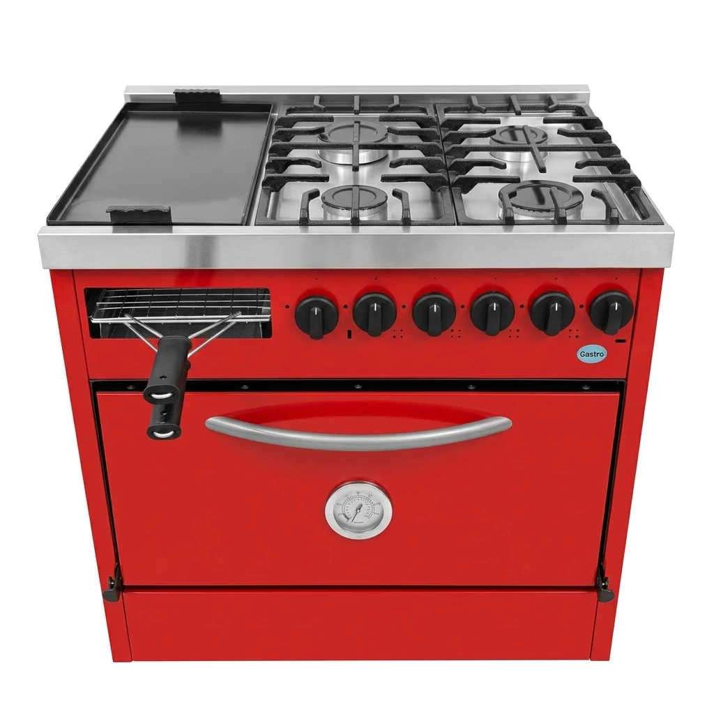 Cocina Industrial 4 Hornallas Con Plancha y Carlitera Gastrolibertad Roja Horno Con Visor